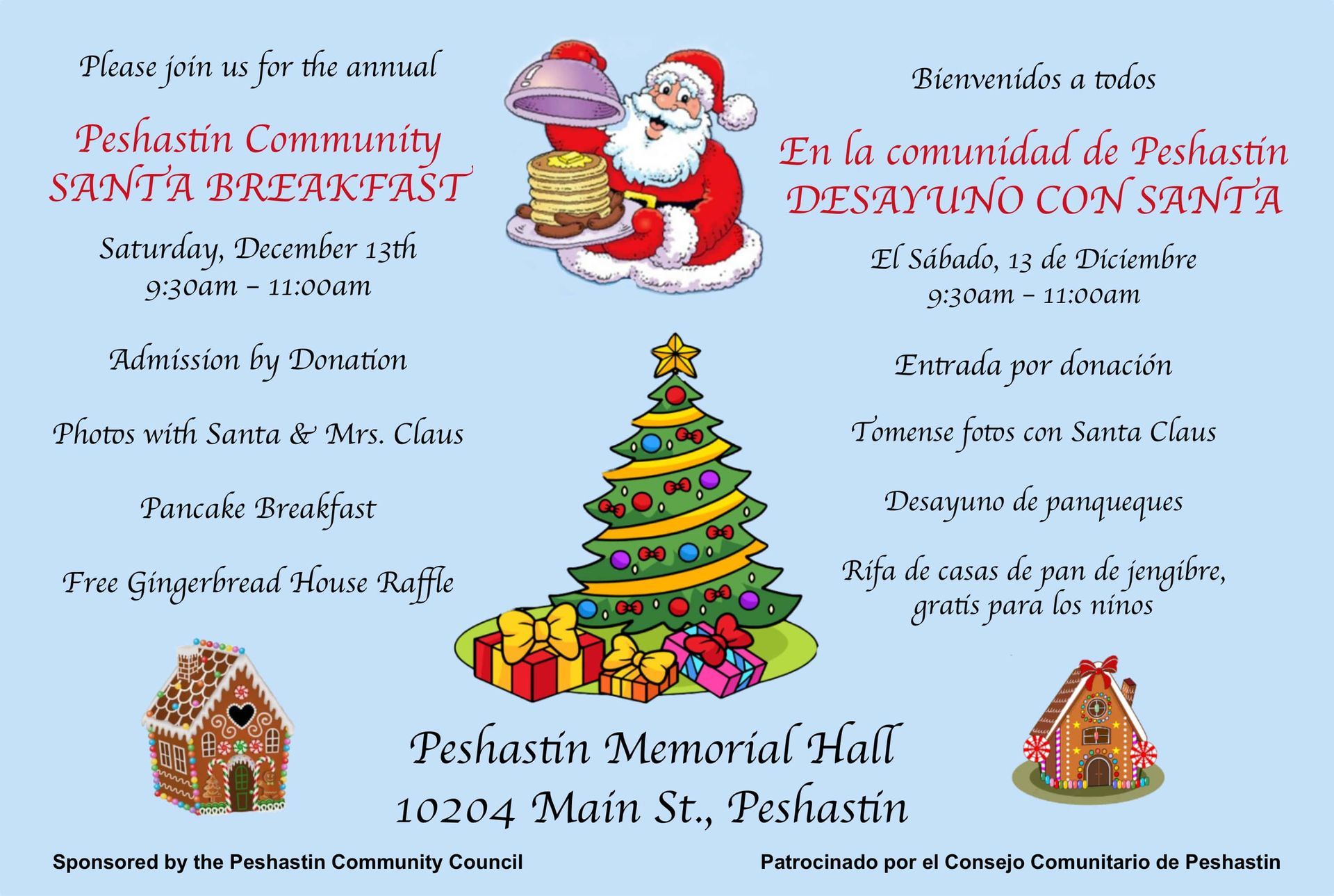 December 13, 9:30-11AM Anual Peshastin Pancake Breakfast with Santa, at the Peshastin Memorial Hall.
